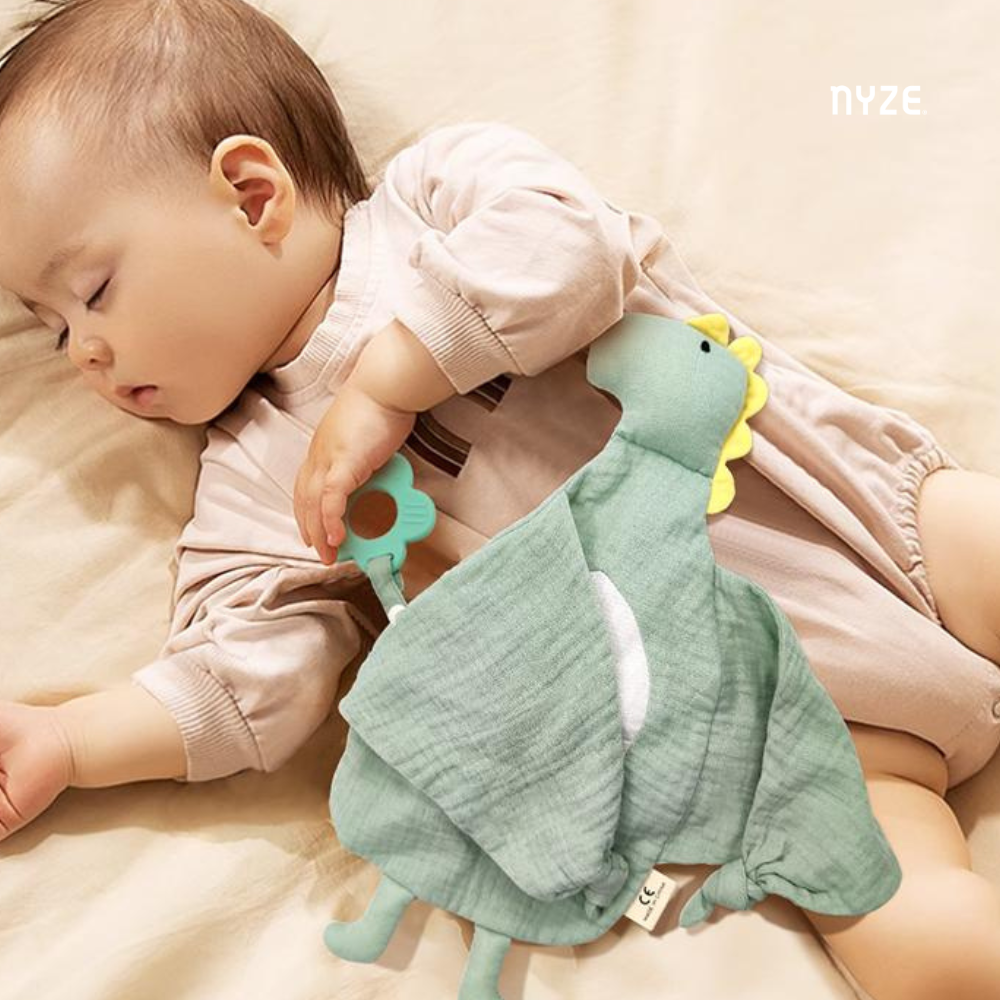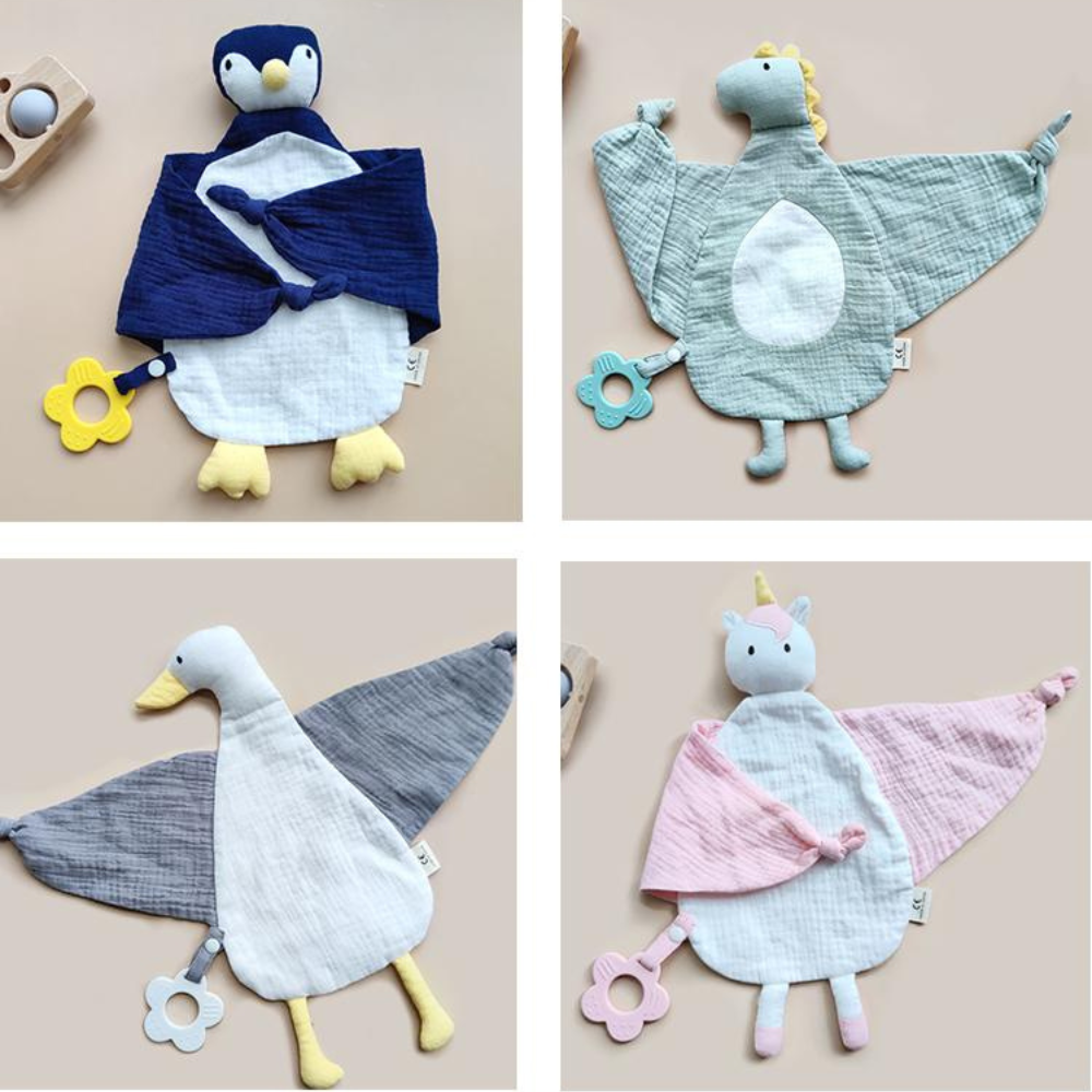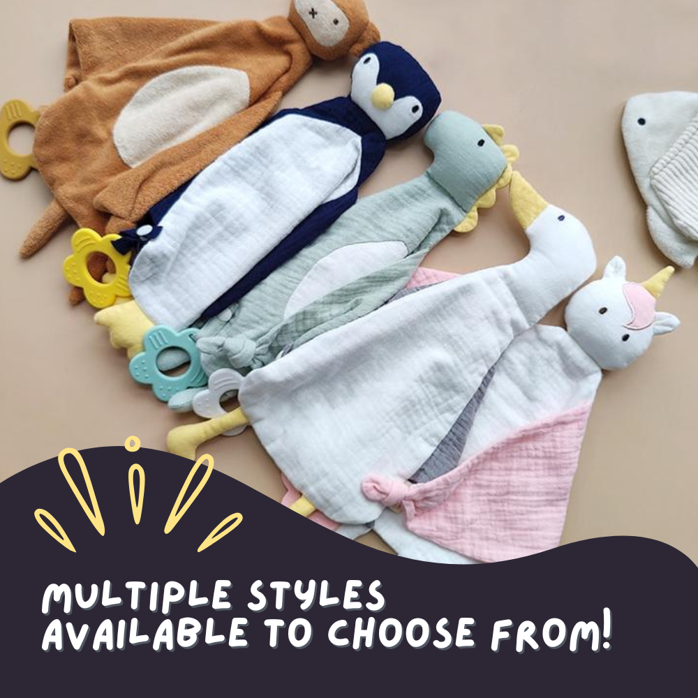 A soft and breathable 2-in-1 comforter and teether, designed to soothe your baby's gums while providing a cuddly companion. Made from 100% cotton muslin with a BPA-free, food-grade silicone teether, it’s gentle, lightweight, and perfect for newborns. Ideal for snuggles at home or on the go!