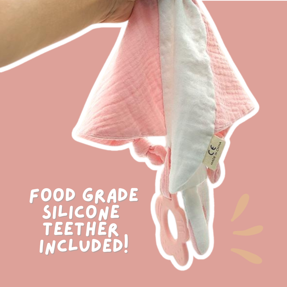 •2-in-1 Comforter & Teether– Combines a soft muslin cloth with a food-grade silicone teether to soothe gums and provide comfort.