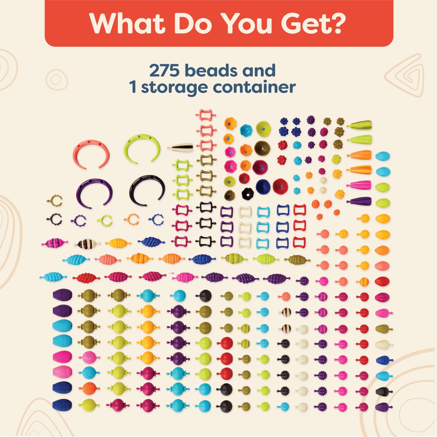 Pop! Pop! Pop! Just try and stop! The B.eauty Pops jewelry making set from B. toys feature a variety of colors, shapes, and textures. Mix and match to create a ton of B.eautiful necklaces, bracelets, and rings – the combinations are endless! All of the reusable beads snap together simply, quickly, and safely. Your little jewelry maker can spend hours designing unique pieces for the whole family, then pop ’em apart and start all over again. Not to mention, cleaning up and traveling is hassle-free – just store all of the beads in the handy jar and carry it with the help of the handle. And because we at B. keep the environment in mind, parents will also be happy to know that our packaging is 100% recyclable. Recommended for kids 4 years and over.