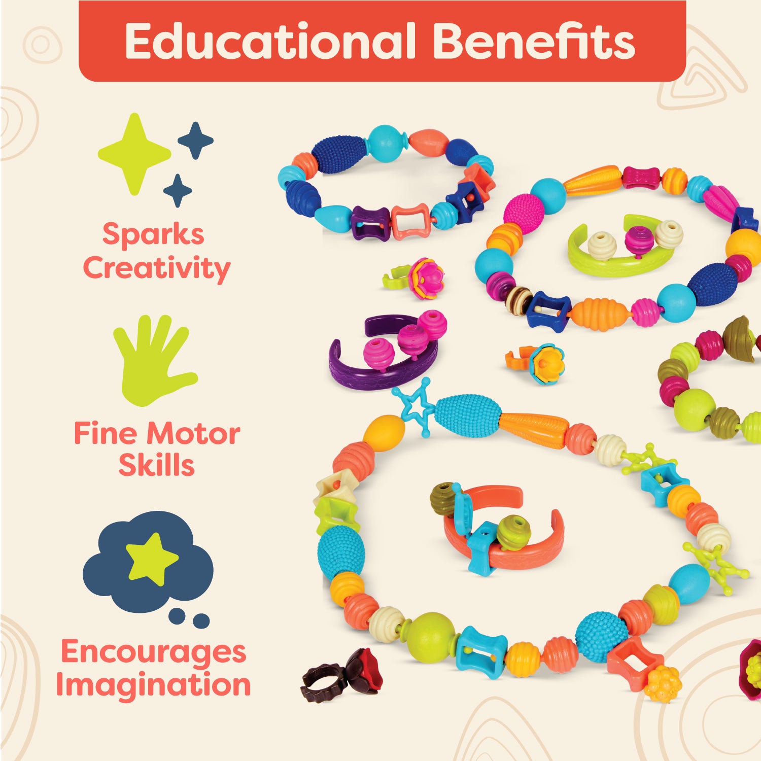 - Creative Play: Coming up with endless jewelry combinations sparks the imagination and promotes creativity.