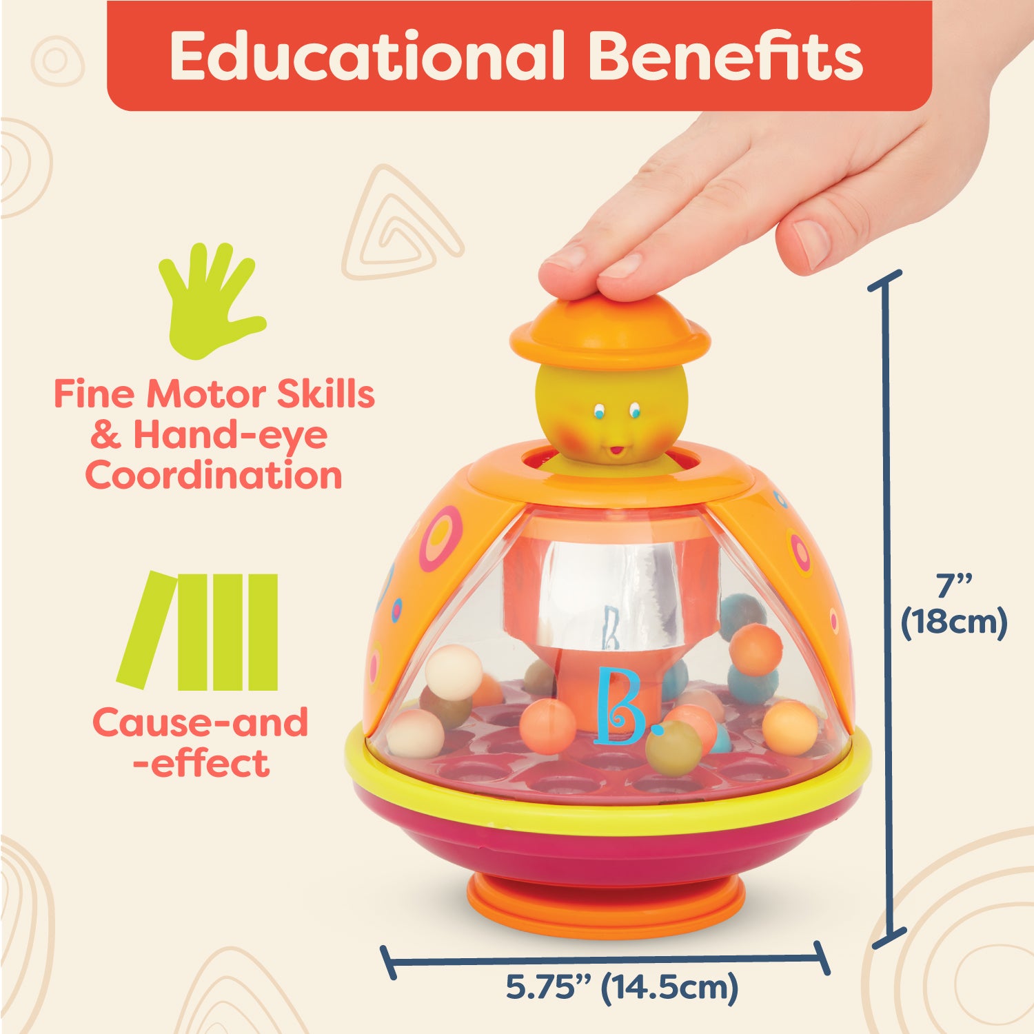 Push the knob on the top to make Poppitoppy pop! This ladybug tumble toy comes with 20 colorful balls – just press her head to see them all pop! Little ones will love seeing Poppitoppy disappear and spring back up, and the reflective surface inside is sure to captivate any curious kiddo. This colorful ball popper is also tiny hands-friendly and developmental! It introduces children to the concept of cause-and-effect and it can help them improve their fine motor skills & hand-eye coordination. And because we at B. keep the environment in mind, parents will be happy to know that our packaging is 100% recyclable.