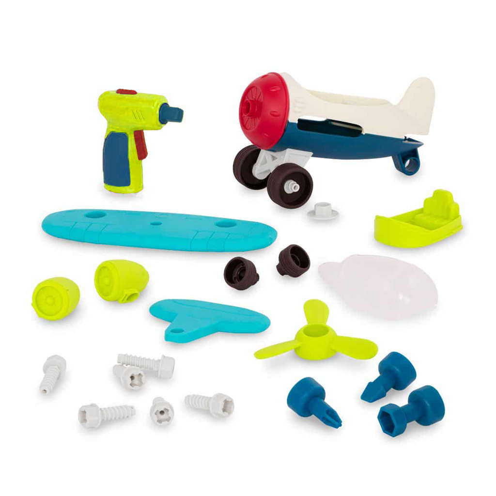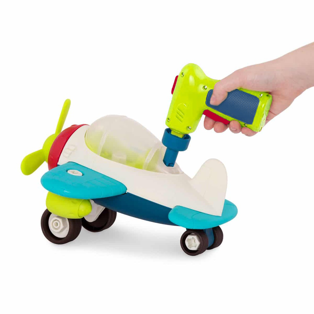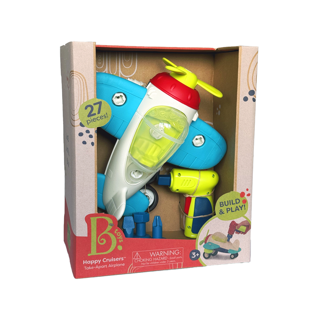 Wheels? Check! Engine? Check! Propeller? Check! The sturdy Happy Cruisers Take-Apart Airplane from B. toys is exciting to build and disassemble… over and over! The nifty drill comes with 3 different bits and works just like the grown-up version. This educational toy includes all of the necessary parts to build a strong and durable airplane. Once you’ve assembled the plane and it’s clear for takeoff, roll the wheels to pick up speed and spin the propeller when you’re in the air! This take-apart airplane is perfect for building fine motor skills, increasing problem-solving abilities, and working on hand-eye coordination. And because we at B. keep the environment in mind, parents will also be happy to know that our packaging is 100% recyclable. 2 AA batteries are required (not included).