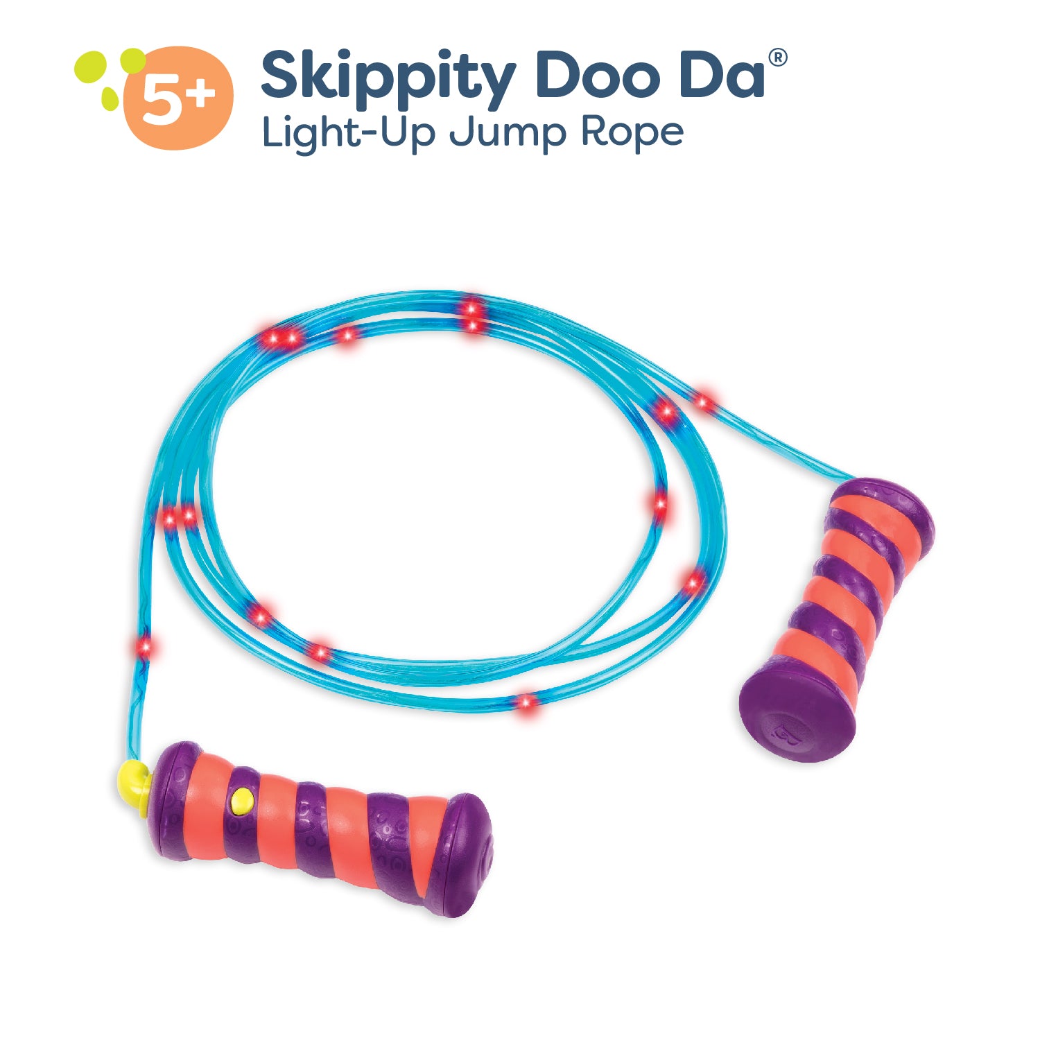 Get moving and grooving with the light-up Skippity Doo Da jump rope from B. toys! Grab the handles and jump up and down to see colorful lights shine all around. Kids can choose between 2 different modes as they play. If they pick Flashing Mode, the lights will flash faster as they step up the pace. If they go for Color-Changing Mode, then the lights will change color as they skip. Playing with this skipping rope is a great way to stay active and improve balance and coordination. Hop, skip, double dutch – what’s your favorite way to play? 2 AAA batteries are required and included.