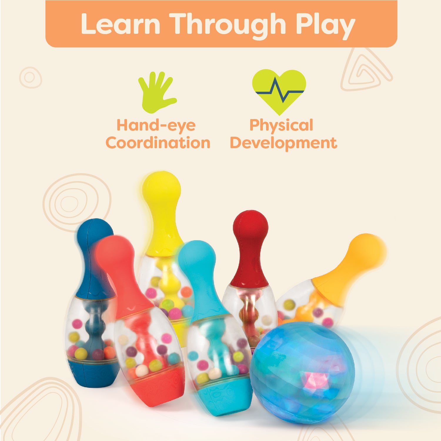 Put on your bowling shoes and get ready to roll with Let’s Glow Bowling! from B. toys. Set up the pins, take a few steps back, aim, toss, and watch the luminous patterns as the bowling ball rolls across the floor! Once the ball hits the hollow pins, the multicolored balls inside will bounce around like crazy. A unique twist on a classic game! Break out this set on family night or take it to a birthday party – all the pins easily fit in the tray that kids can carry themselves, thanks to a handy handle. Not to mention, playing this game can also improve your little bowler’s dexterity, balance, and hand-eye coordination. And because we at B. keep the environment in mind, parents will be happy to know that our packaging is 100% recyclable.