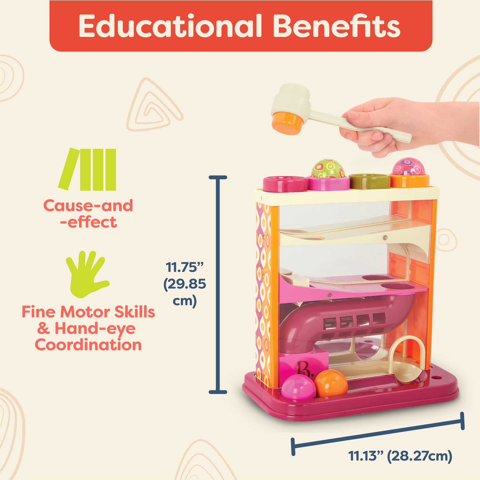 Grab a hammer and whack away with Whacky Ball from B. toys! Pop the colorful balls in the holes on top, pound them with the hammer, and watch them go through a fun maze! Set against a mirrored background, the balls first roll through a spinning wheel, then pass through a tunnel, and finally show up on a handy tray that catches them all. As kids play away, they’ll be developing their fine motor skills and hand-eye coordination. A learning toy that’s sure to keep little ones busy for hours!