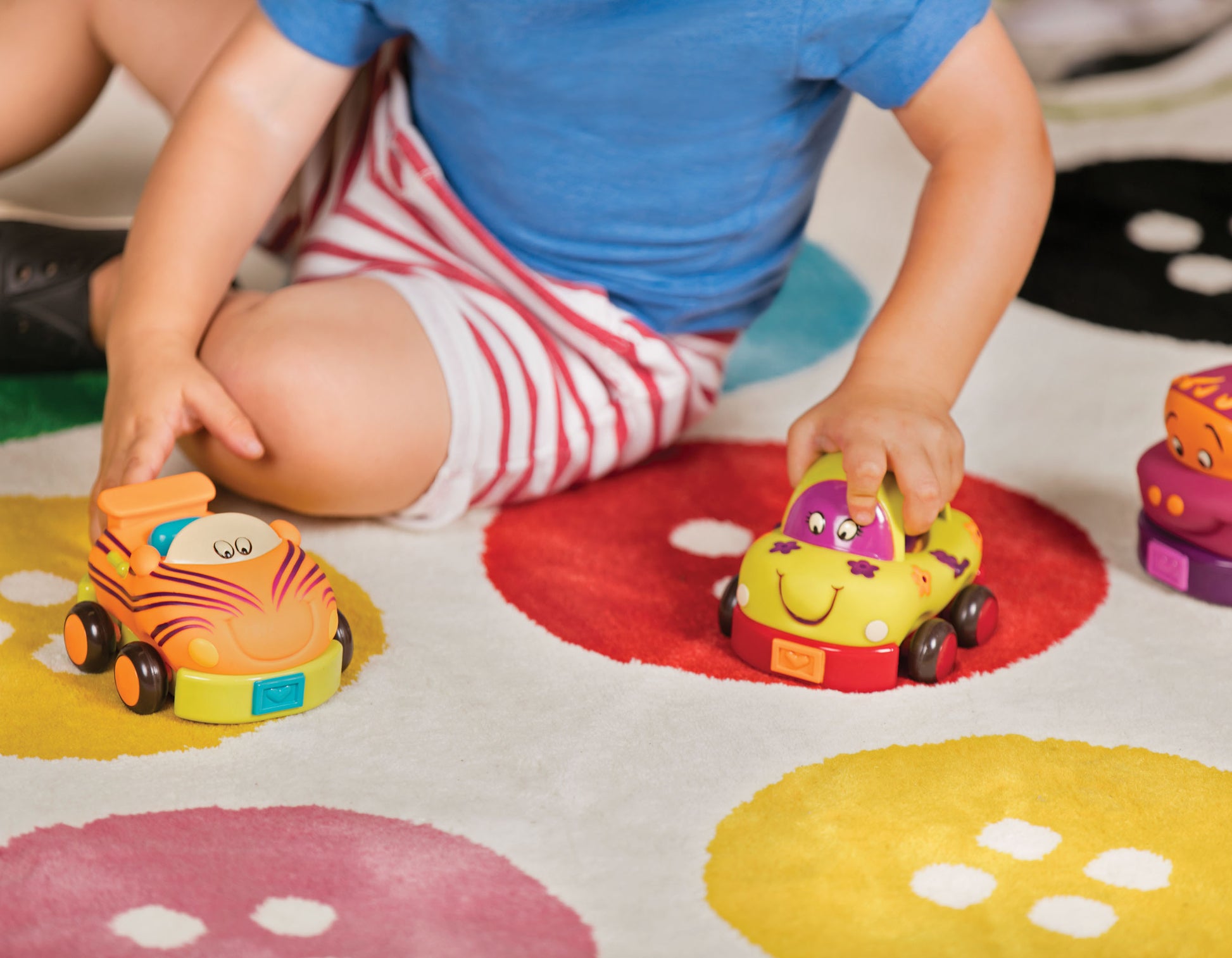 Hit the road, the wall, or the sofa while playing with your Wheeee-ls! These smiley and squishy vehicles come in a fun pack of four that includes a car, pick-up truck, racer, and a taxi. Little ones can easily pull these tiny hands-friendly vehicles back and release them to safely self-propel around the house. Each chunky car sports a different personality and comes with its own unique sound. The car rings, the truck chimes, the racer rattles, and the taxi squeaks! These classic toys are also great for developing a child’s auditory and motor skills. And because we at B. keep the environment in mind, parents will also be happy to know that our packaging is 100% recyclable.
