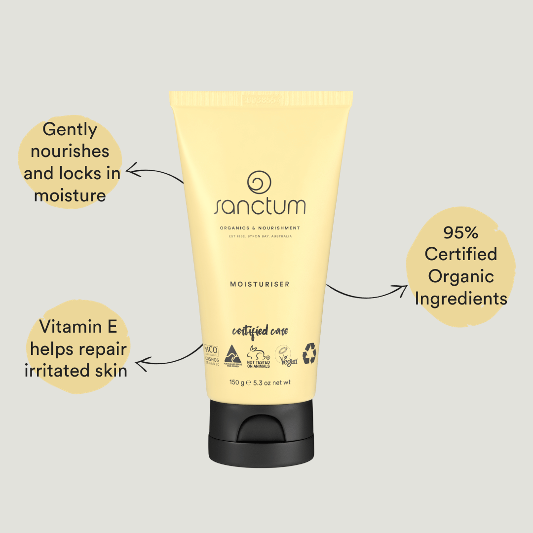 Experience the purest organic skincare for your little one with Sanctum's Baby Moisturiser. This daily lotionis designedto hydrate, soothe, and protect your baby's delicate skin. The first few years of your baby's lifeare filledwith many new experiences, and their first skincare experience should be 100% chemical-free. Our Baby Moisturiser is 100% natural, formulated to support your baby's skin with gentle hydration and nourishment from actives and ingredients.
