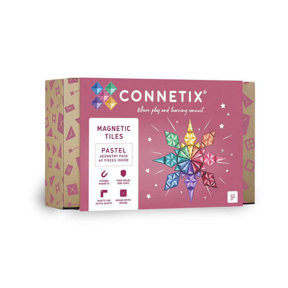 As an open-ended quality toy, Connetix will grow WITH your child as they learn and their play becomes more complex. Extend the possibilities for magnetic tile learning and play by complementing your 40 piece Pastel Geometry Pack with our 120 piece Pastel Creative Pack or 202 piece Pastel MEGA Pack to take your magnetic tile play fun to the next level.