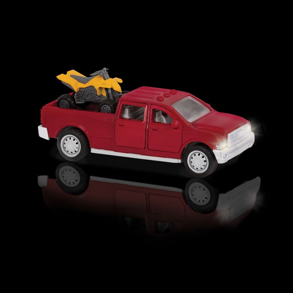 - Toy Vehicle: Miniature toy pick-up truck with toy ATV.