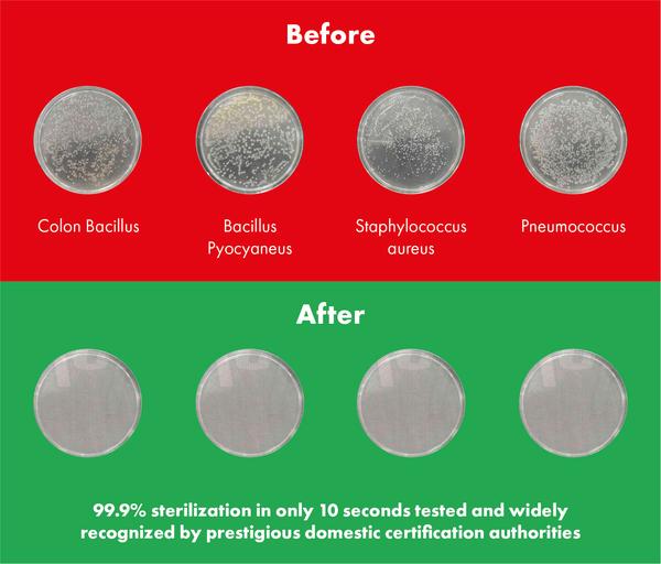 - Sterilizing 99.9% of pneumococcus, colon bacillus, pseudomonas aeruginosa and staphylococcus aureus