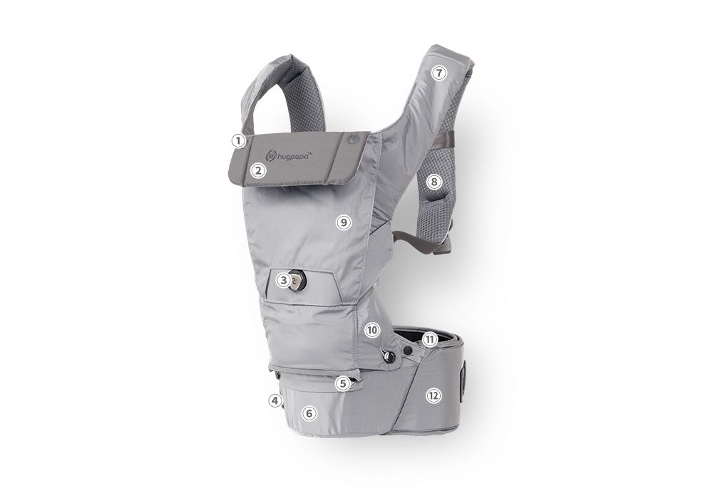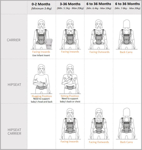 - 6 position available; Face inward in the hip seat, Face-inward & outward in hip seat carrier, Face-inward & outward in the baby carrier, Back carry in the baby carrier