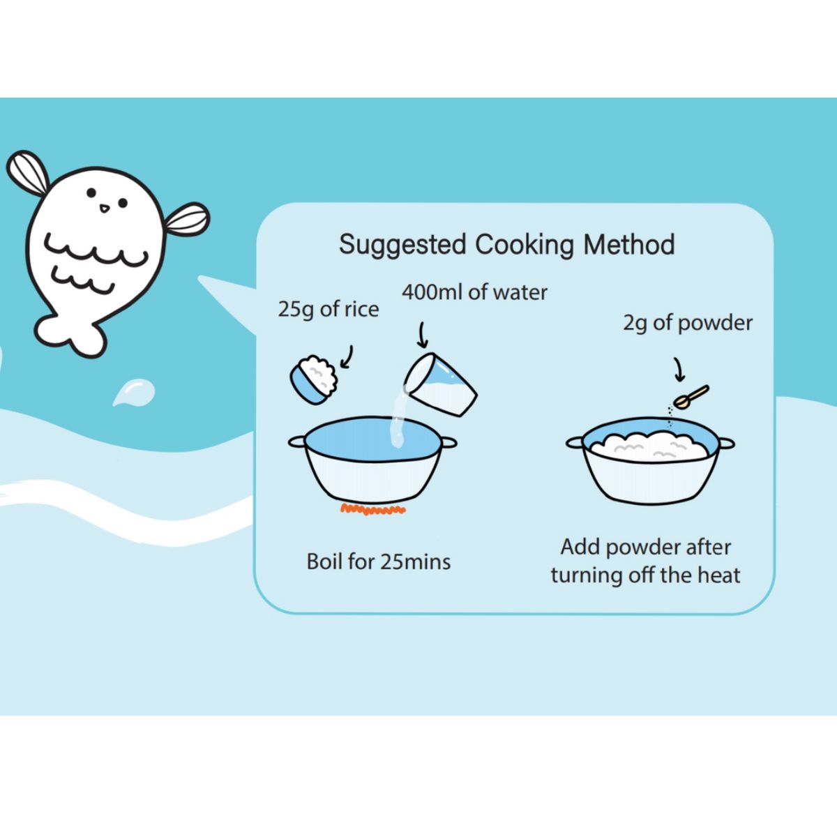 1) Add in 25g of rice and 400ml of water, boil for 25mins 2) Add 2g of food powder after turning off the heat