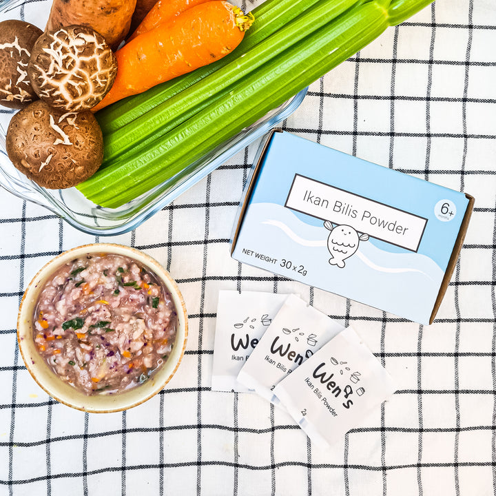 Wen's Ikan Bilis Powder is container Ikan Bilis dried and grinded into powder. It is rich in DHA, Protein, Calcium, Magnesium and Phosphorus - which is good for babies, children and pregnant mothers. Add your preferred amount (usually 1 scoop of the included wooden spoon or less) into baby's food/porridge for a nutrient and taste boost!