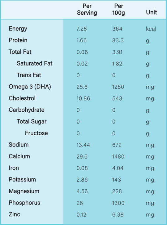Ikan Bilis powder has EXTREMELY minimal sodium content, with only 0.01g of sodium per serving!