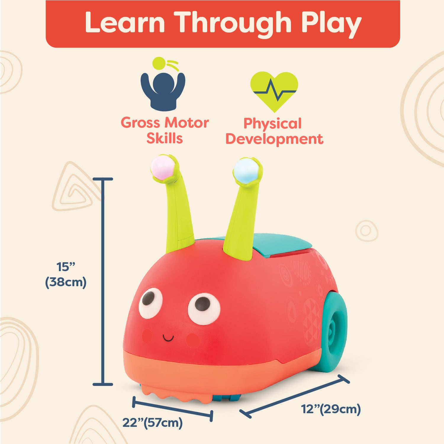 Need a reliable ride? Just hop on the Ladybuggy from B. toys and scoot the days away! This ladybug-inspired toy comes with everything toddlers need for smooth and fun rides. As they roll, kids can press the antennae to make this buggy buddy light up and play silly sounds. And if they need to grab a few things on-the-go, kiddos can store their tiny treasures right under the comfy seat. The wheels roll smoothly on flat surfaces, so you can easily give little ones a push to help them along the way or let them explore on their own. No matter how kids choose to play, the Ladybuggy is sure to keep them active and will improve their gross motor skills. 3 AAA batteries are required and included. Recommended for children 12 months and over.