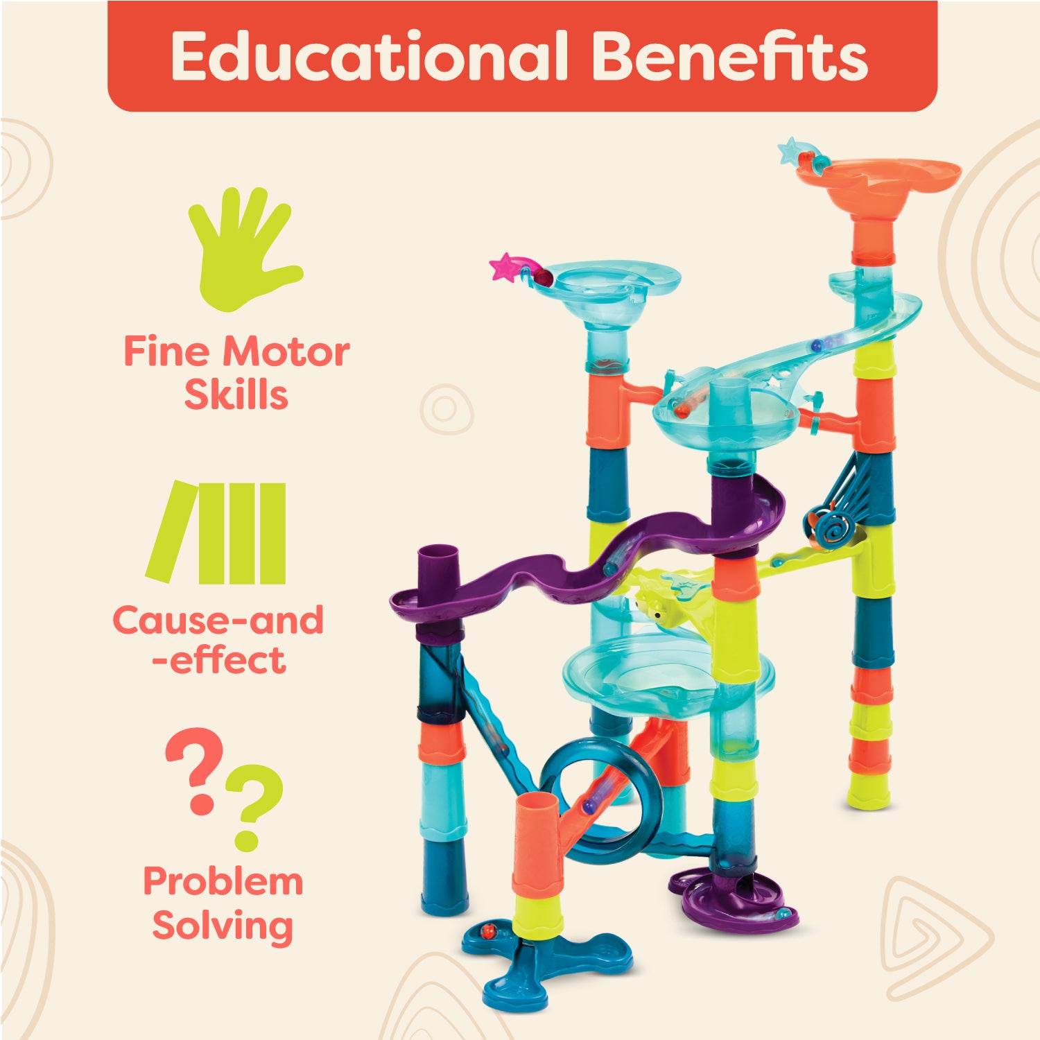 - Developmental Toy: Playing with the Marble-palooza improves fine motor skills, cause-and-effect reasoning, and creative thinking skills.