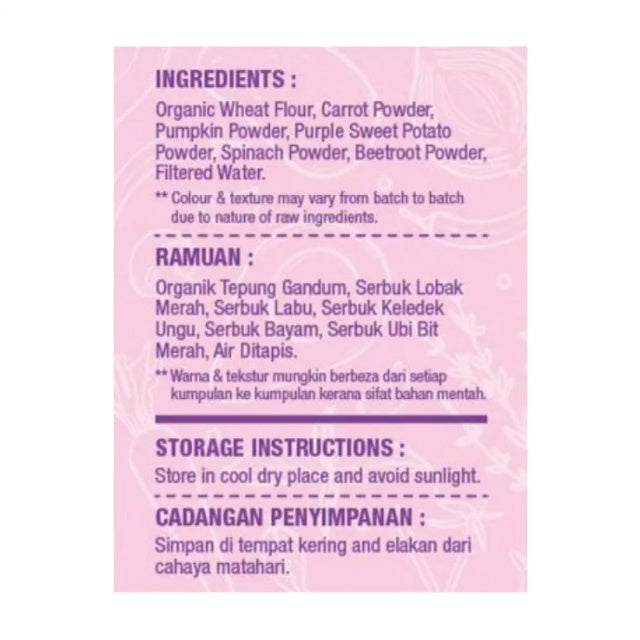 - Ingredients: Organic Wheat Flour, Carrot Powder, Pumpkin Powder, Purple Sweet Potato Powder, Spinach Powder, Beetroot Powder, Filtered Water