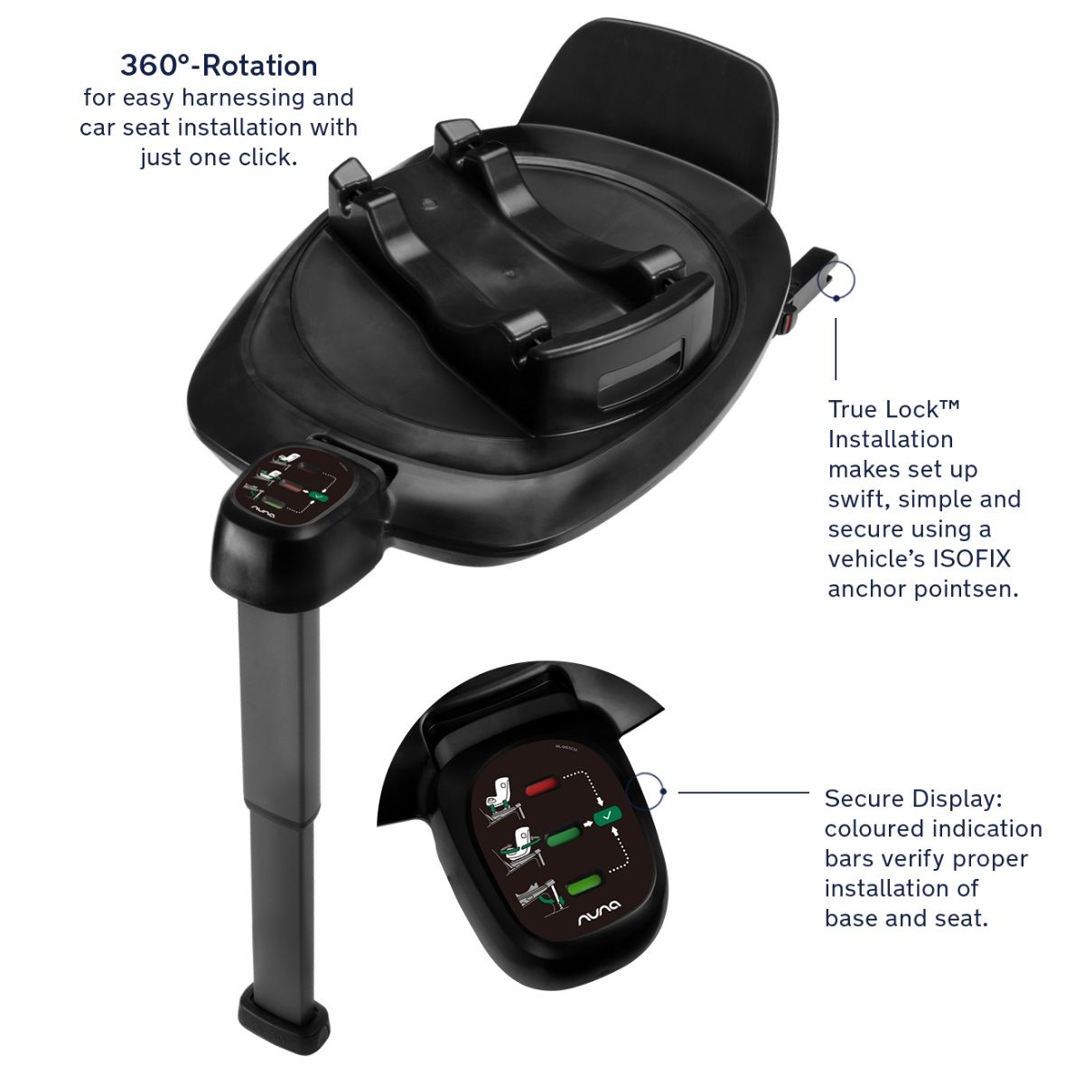 - 360° rotation for easy harnessing and next system car seat installation with just one click.