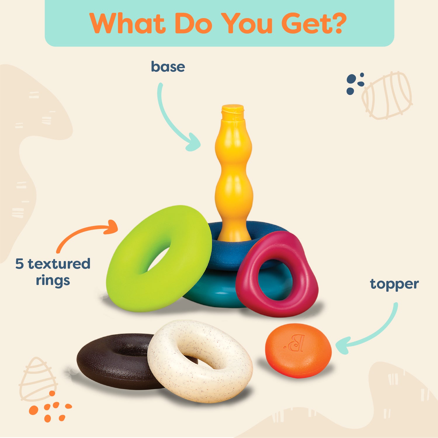 - Sensory Rings: Babies can touch, build, stack, or chew on the different rings to discover all kinds of materials, colors and textures!