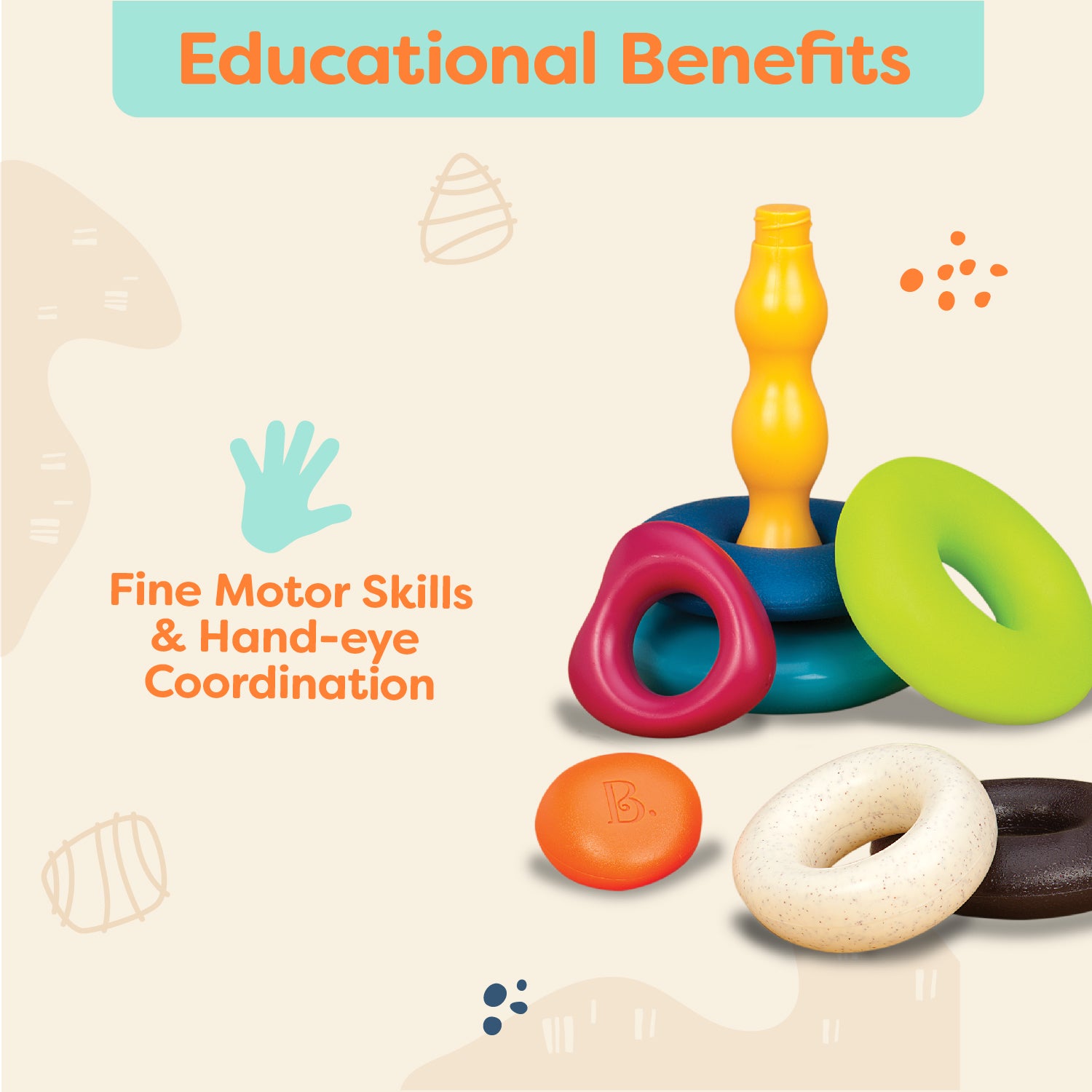 - Developmental Toys: These stacking rings can spark a baby’s curiosity, introduce them to problem solving, and help them improve their fine motor skills.