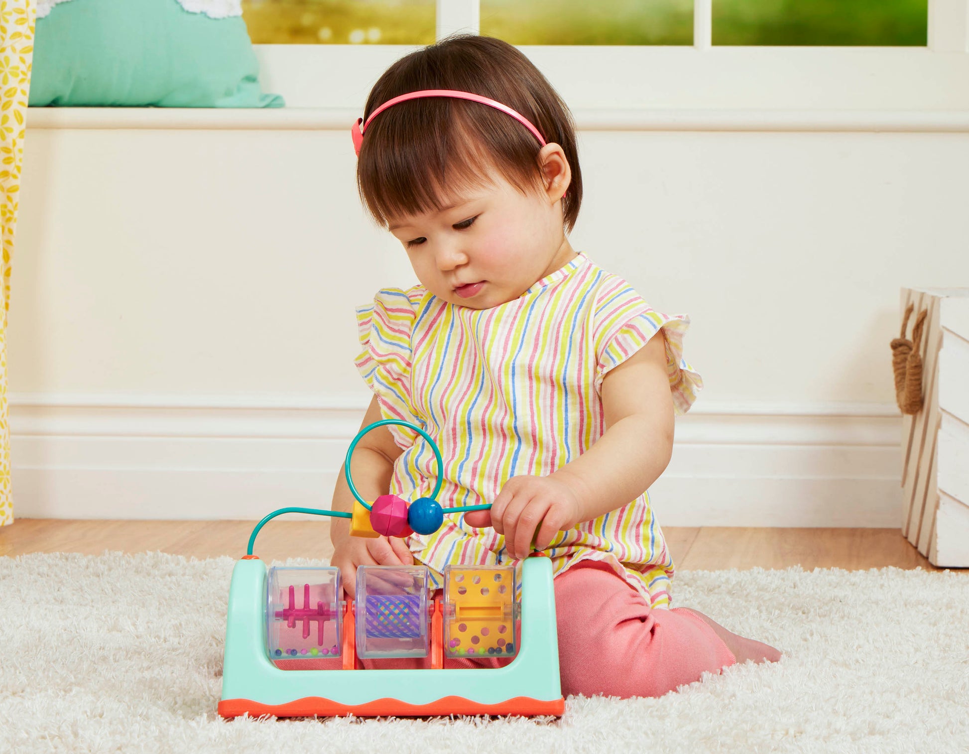 - Fun Features: Move the chunky beads along the maze, then play with 3 clear spinners that feature lil’ balls, paddles, and noisemakers.