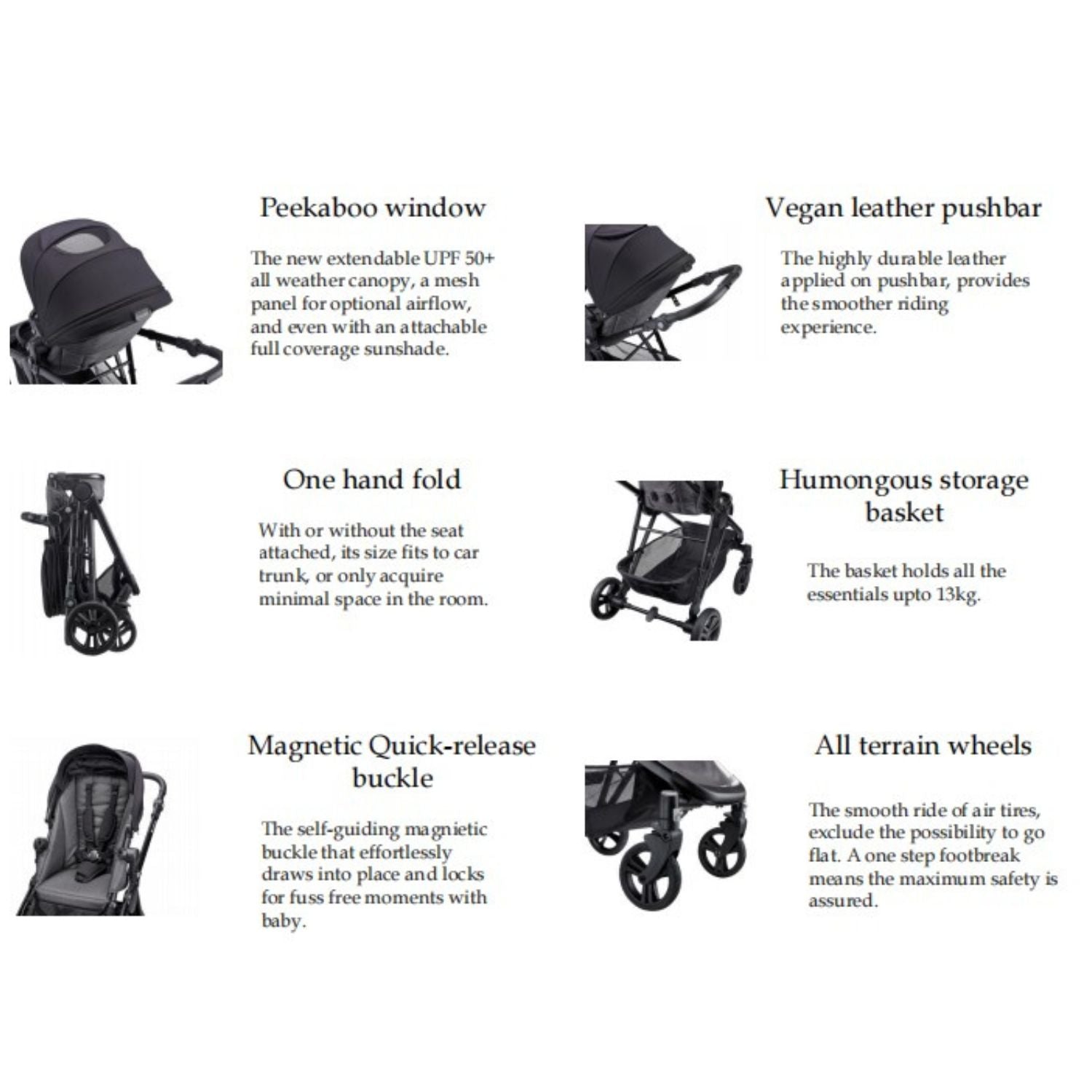- Weight Support: 22kg for one seat, 10kg for the storage basket, 54kg for the whole car